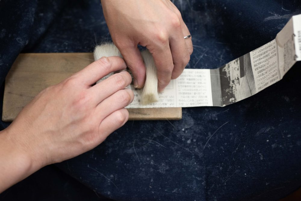 筆作りの工程は原毛の選別~下仕事、上仕事、仕立てと数十に及びます。